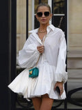 The turn-down lapel collar adds a refined touch, and the puff sleeves bring a hint of vintage-inspired charm. With chic pleated details and a versatile solid colour design, this dress easily transitions from urban casual to elegant evening looks.