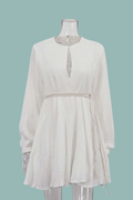 Elegant Beige Cotton Dress – V-Neck, Long Sleeve, Mini Pleated Skirt, Casual