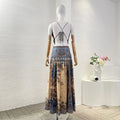Design: Deep V-neck, backless, halter top, A-line silhouette