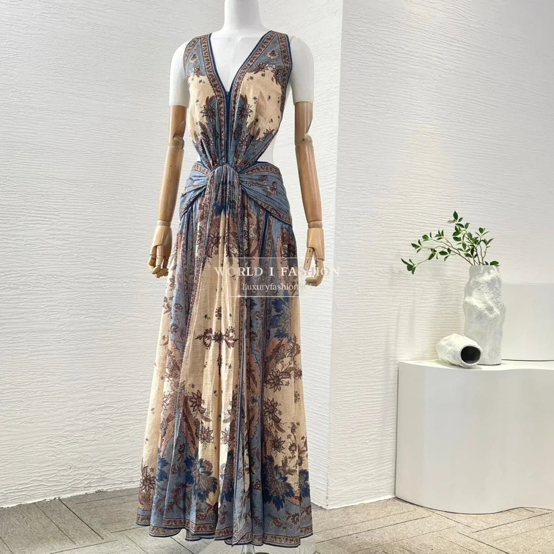 Elegant Cotton Midi Dress – Deep V-Neck, Backless & Sexy Slit