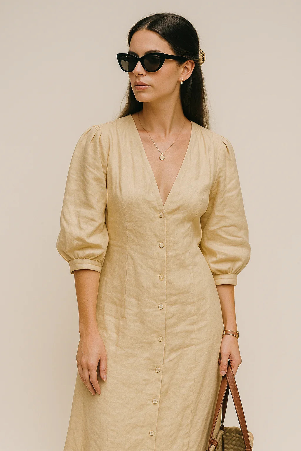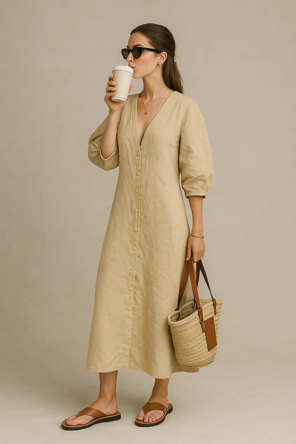 Retro Chic Long Dress – V-Neck, Puff Sleeves, Cotton & Linen Elegance