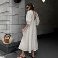 O comprimento até a panturrilha e o corte em A criam um caimento perfeito para todos os tipos de corpo, enquanto as mangas bufantes e o decote em V adicionam um toque de charme vintage. Detalhes vazados sutis realçam o visual feminino, conferindo-lhe um toque chique e delicado.