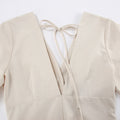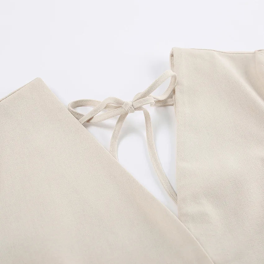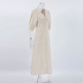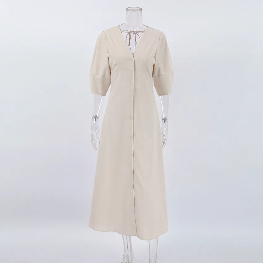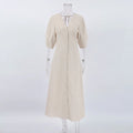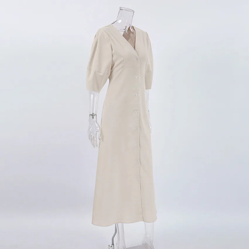 Vestido longo retrô chique – decote em V, manga bufante, elegância em algodão e linho