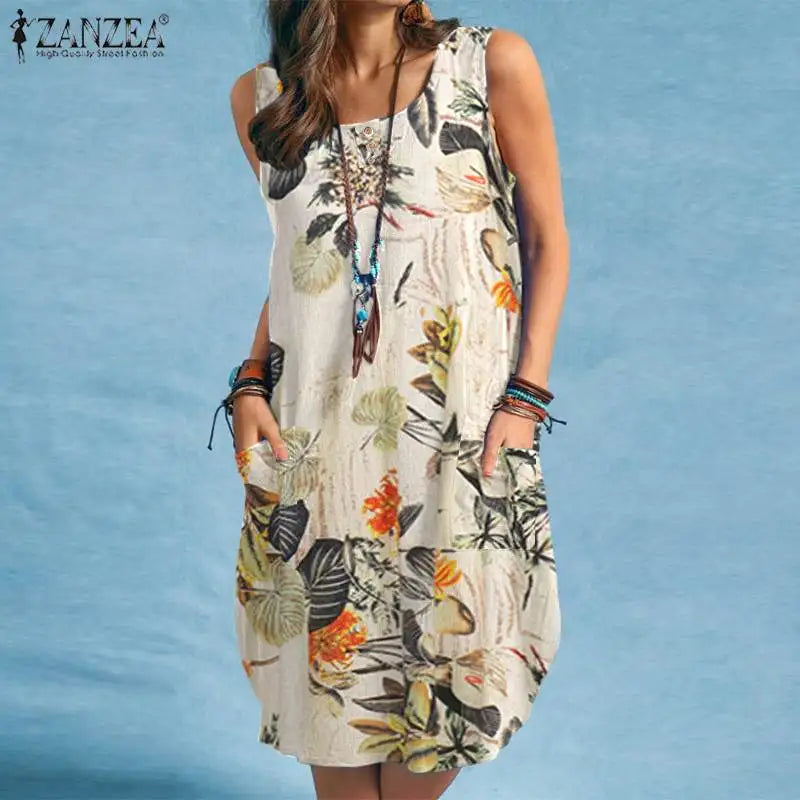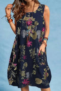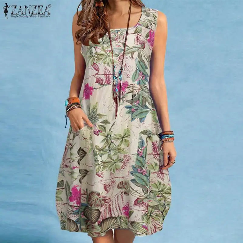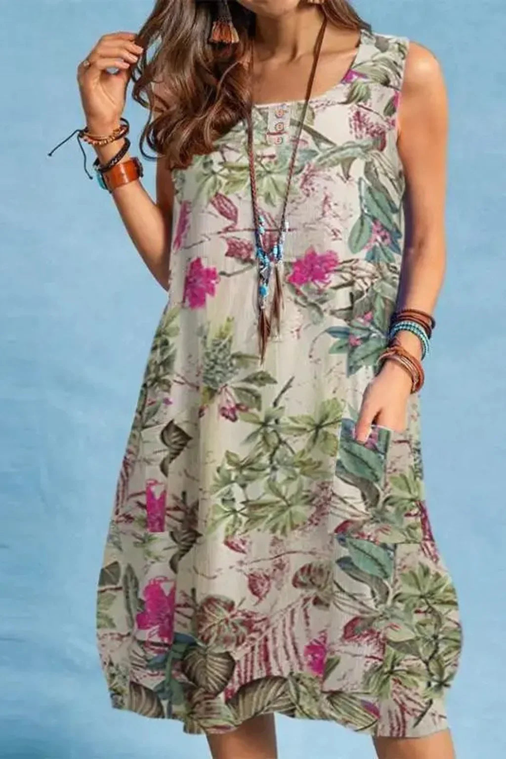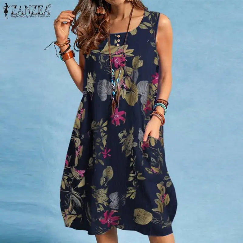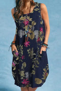 The sleeveless O-neck design and above-knee length make it versatile and flattering, while the A-line silhouette ensures a relaxed yet chic fit. Featuring side pockets, it combines practicality with bohemian charm, perfect for women who love style with function.