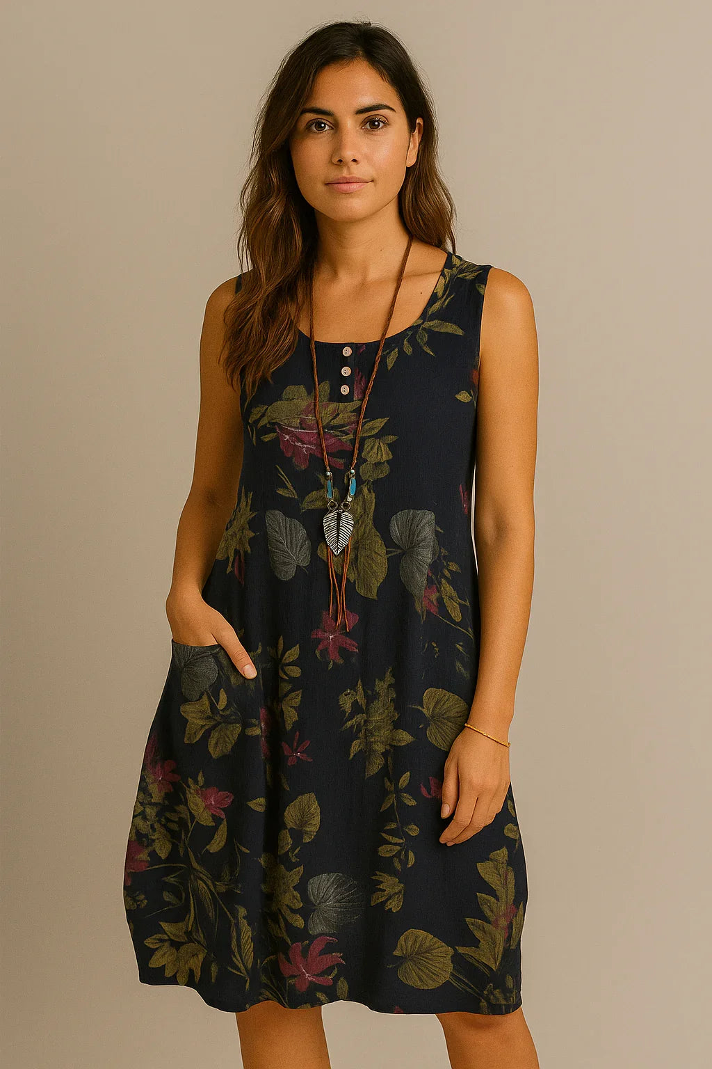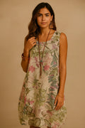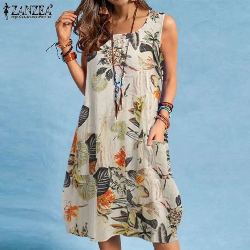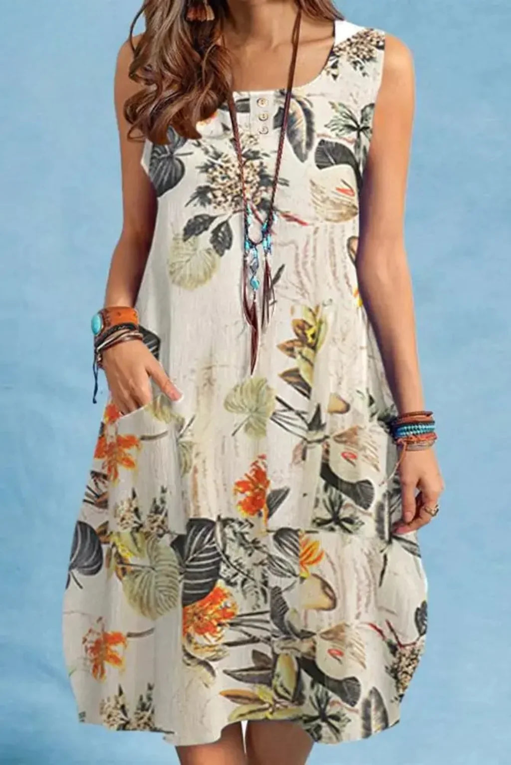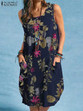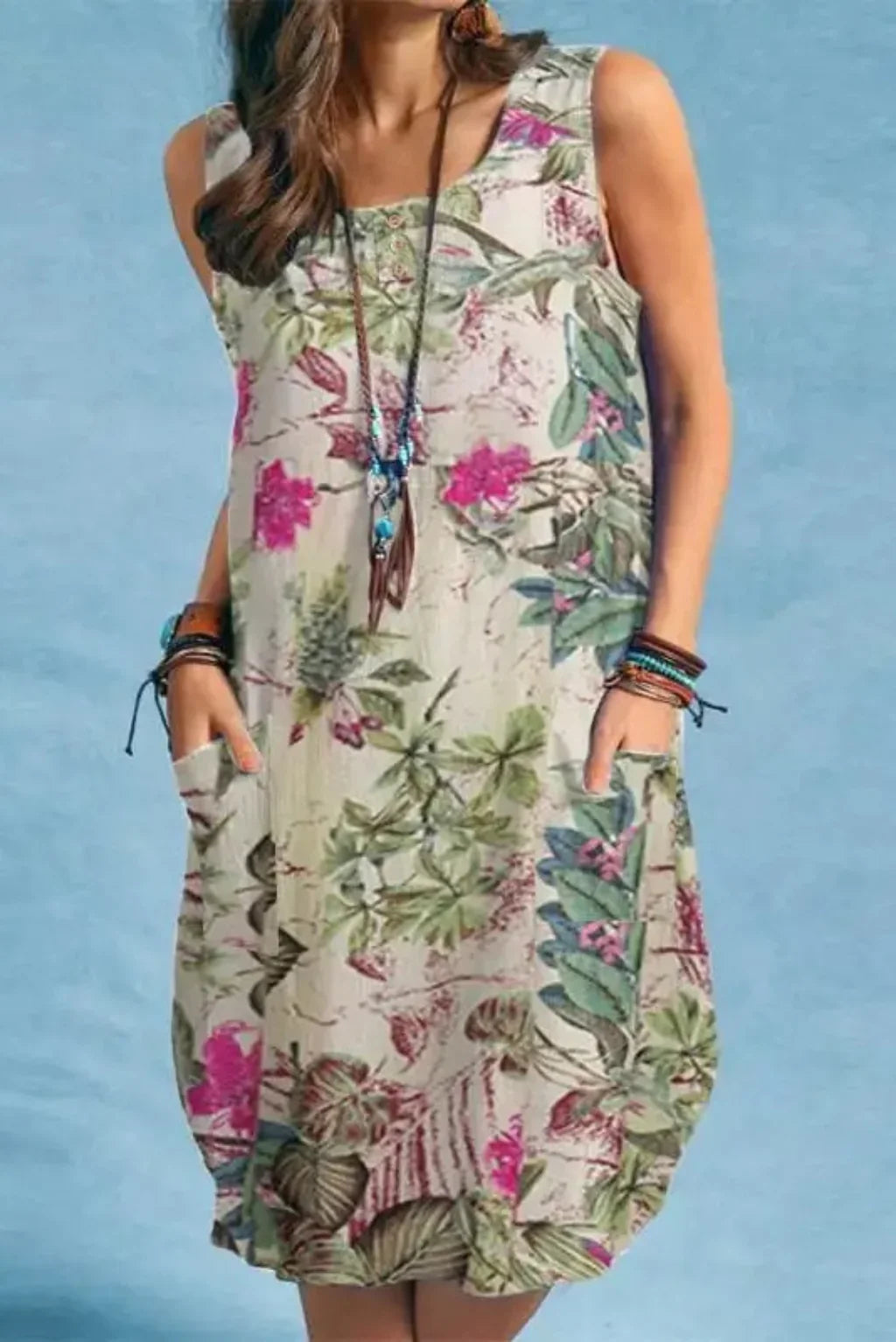 The sleeveless O-neck design and above-knee length make it versatile and flattering, while the A-line silhouette ensures a relaxed yet chic fit. Featuring side pockets, it combines practicality with bohemian charm, perfect for women who love style with function.
